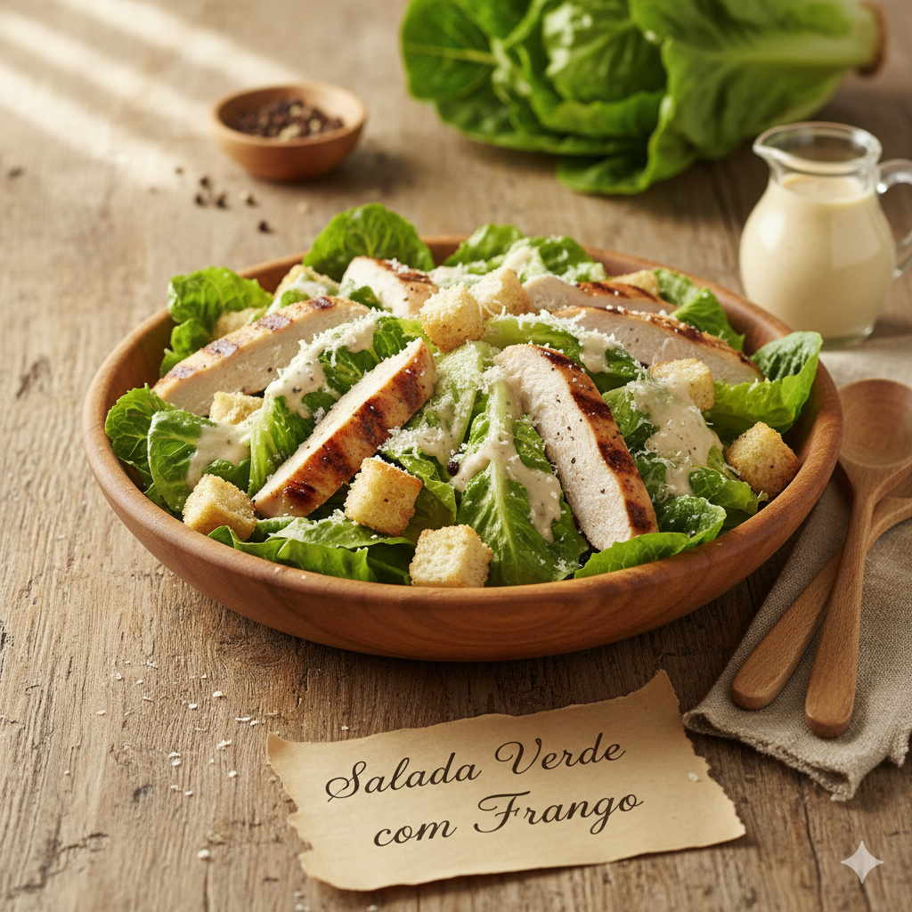 Uma salada pode ser um prato principal, especialmente quando é tão rica e satisfatória quanto esta. A união de folhas frescas, um frango grelhado suculento e um molho cremoso e caseiro transforma a Salada Verde com Frango em uma opção de jantar que agrada a todos os paladares. É a escolha perfeita para quem busca uma refeição completa, mas com calorias controladas.