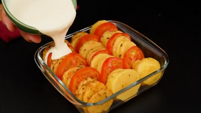 - Em uma travessa que possa ir ao forno, faça camadas alternadas de batata temperada e tomate.