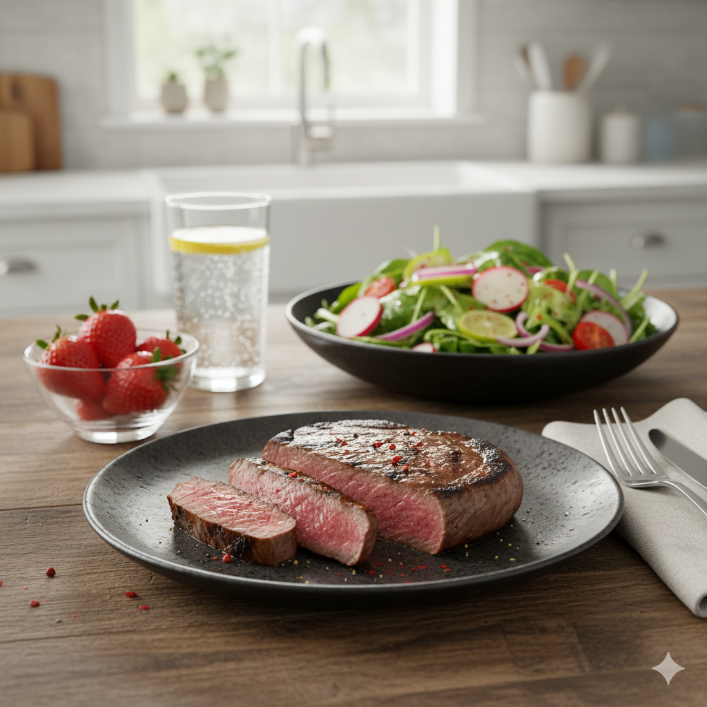 - Almoço (Carne magra grelhada, salada com pimenta + morangos): ~450-650 calorias