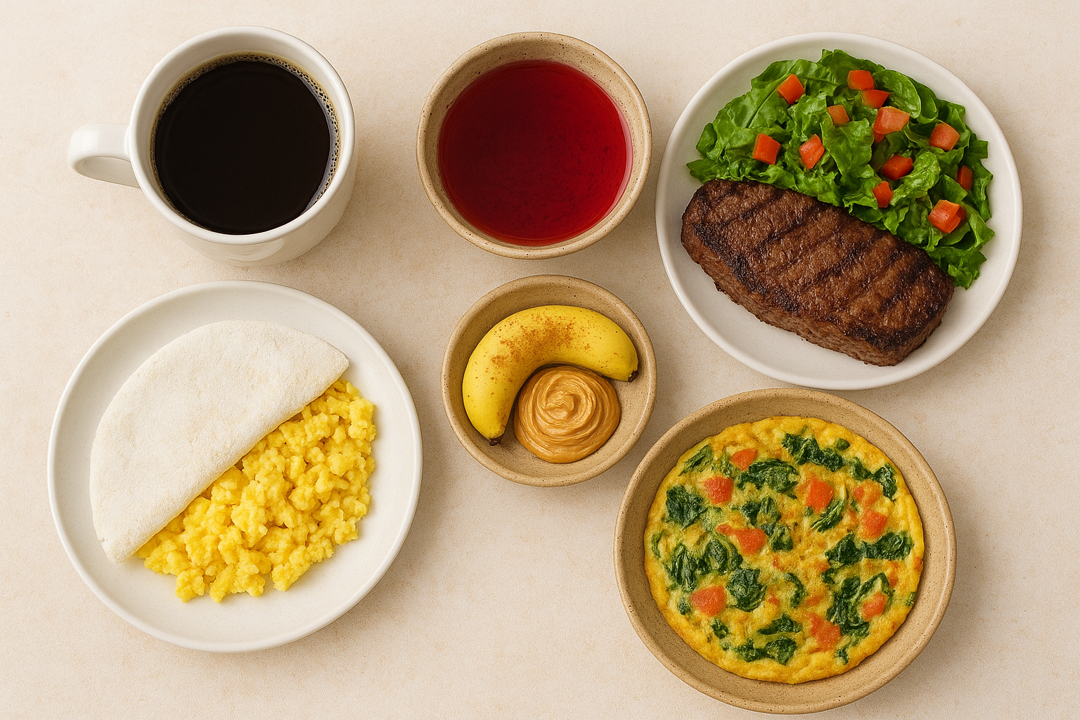 - Café da Manhã (Café preto + tapioca com ovo mexido): ~250-350 calorias