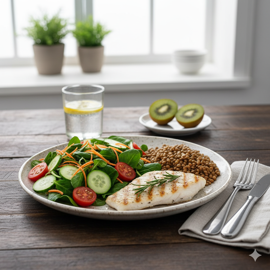 - Almoço (Peixe/frango, salada, grãos + kiwi): ~450-600 calorias
