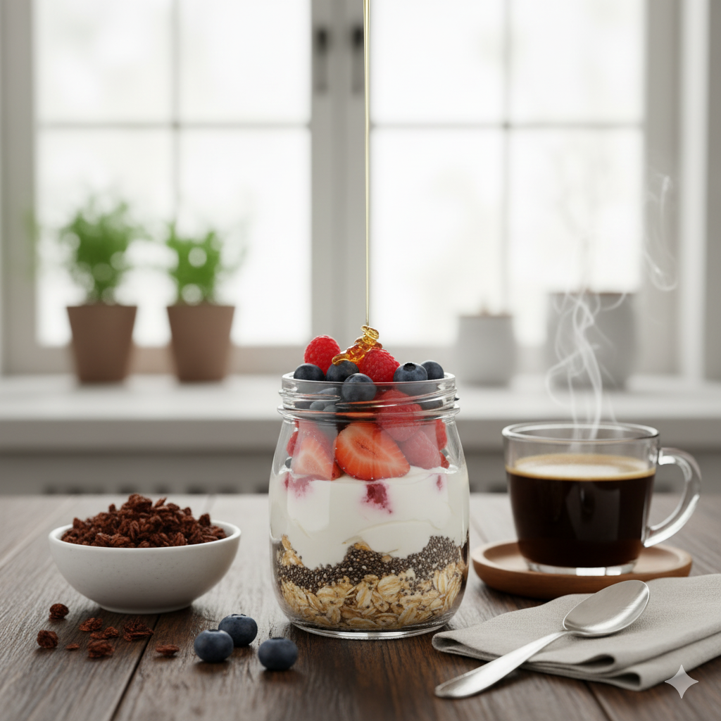 Este café da manhã representa perfeitamente a filosofia da reeducação alimentar. O iogurte natural serve como nossa base de proteína e probióticos, garantindo a saciedade matinal e cuidando da saúde do nosso intestino, o nosso “segundo cérebro”. Manter um microbioma saudável é fundamental para o equilíbrio do humor e a absorção de nutrientes, um pilar que reforçamos ao longo de todo o Desafio Fit.
