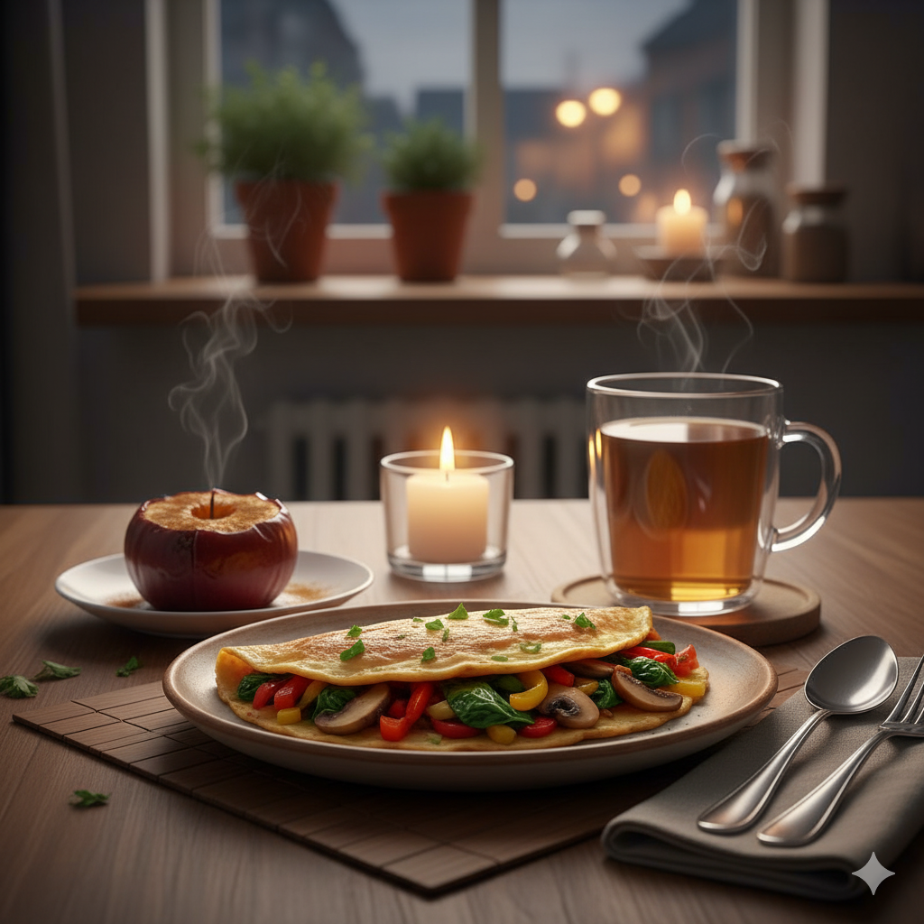 Encerramos nosso último dia com uma refeição que se tornou uma amiga ao longo desta jornada: o omelete. É uma opção leve, versátil, rica em proteínas e perfeita para uma noite de sono reparadora.